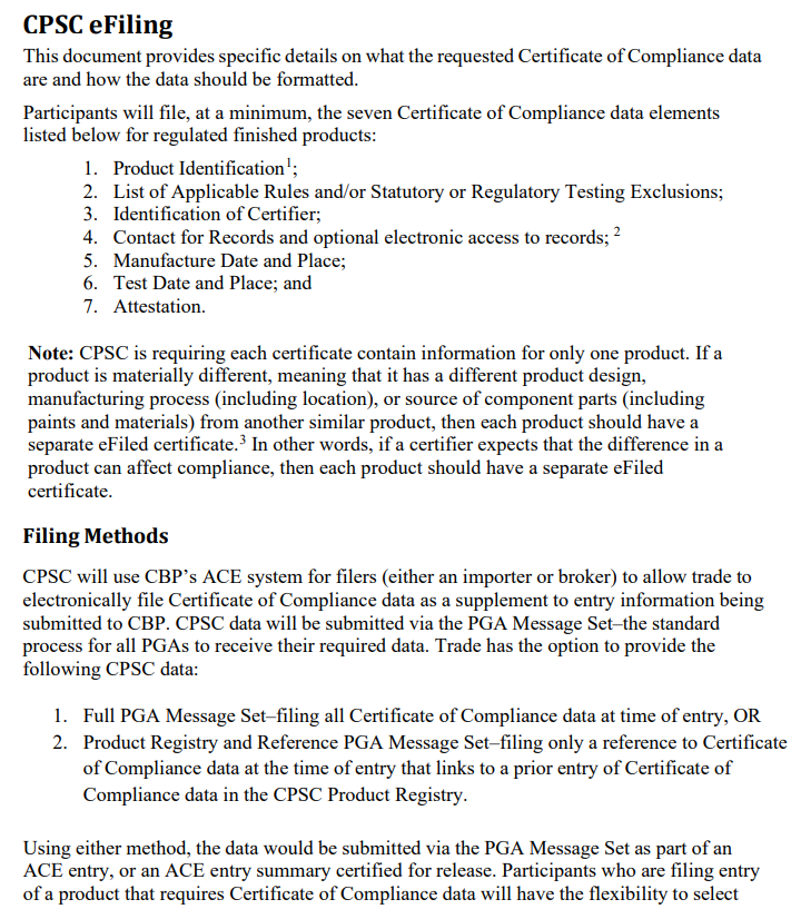 根据美国消费品安全委员会(Consumer Product Safety Commission 简称:CPSC)发布的指导文件,自2026年7月8日起,所有受监管的进口消费品,必须通过美国海关(U.S. Customs and Border Protection简称:CBP)的ACE系统完成电子申报(eFiling),提交产品合规证书相关数据。